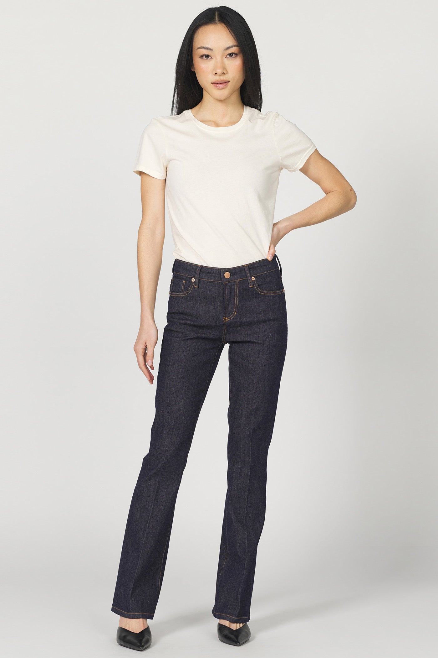 A timeless classic for every wardrobe, these mid-rise jeans feature a sleek, straight-leg fit with just the right amount of structure. Designed with a 31" inseam, they offer a versatile length that pairs effortlessly with both flats and heels. The rich dark-wash denim and contrast stitching give them a polished finish, making them perfect for both casual days and elevated nights out.