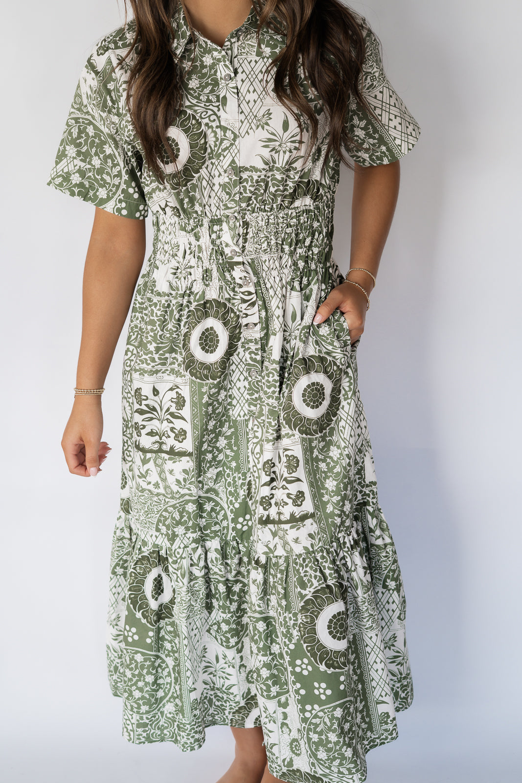 Effortlessly chic and beautifully feminine, this midi dress is the perfect blend of comfort and style. Designed in a soft green botanical-inspired print, it features short sleeves, a relaxed button-front bodice, and a tiered skirt that adds gentle movement with every step. The lightweight woven fabric drapes gracefully, making it ideal for warm-weather days, weekend outings, or easy everyday wear.