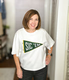 Cheer in style with this spirited “Sic ’Em” Game Day Tee! Crafted from a soft white cotton/poly blend, this relaxed-fit top features a bold green and gold pennant graphic for the ultimate Baylor pride statement. The boxy silhouette and drop sleeves give it a modern, easy-to-wear shape—perfect for pairing with jeans, shorts, or layered under a jacket on cooler game days. Comfortable, casual, and spirited, it’s the go-to tee for tailgates, watch parties, and every Bears victory celebration.