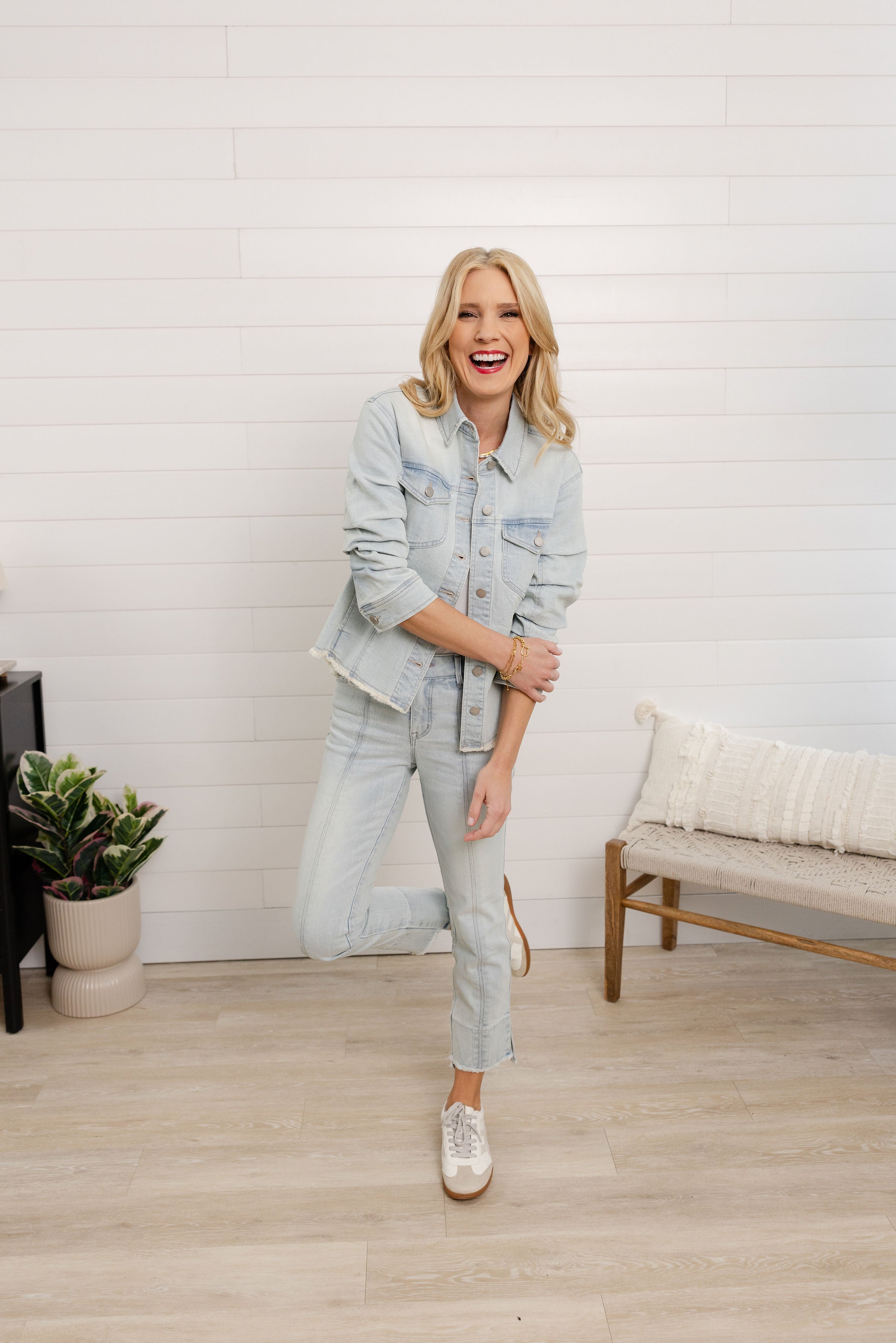 The Mac and Me Bleached Blue Kick Flare w/ Fray Hem brings our beloved kick flare silhouette into a fresh, eye-catching wash. Designed in a cool bleached blue denim, this pair features a center front seam that creates a long, flattering line down the leg. The finished raw hem adds just the right amount of edge, while the cropped kick flare keeps the look modern and versatile. Comfortable, confidence-boosting, and endlessly wearable — plus there’s a matching jacket for a head-to-toe moment.