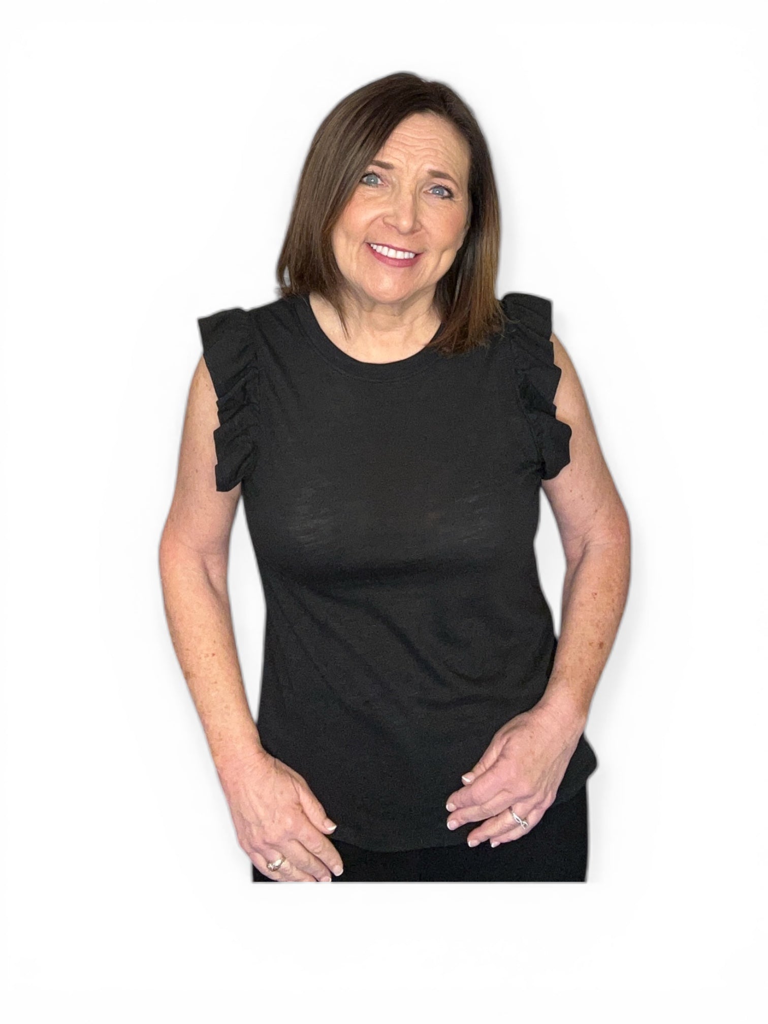 Effortlessly polished with a feminine twist, this sleeveless black top is the perfect blend of simplicity and style. Designed with soft ruffle detailing along the shoulders, it adds just the right amount of texture while keeping the silhouette clean and flattering.