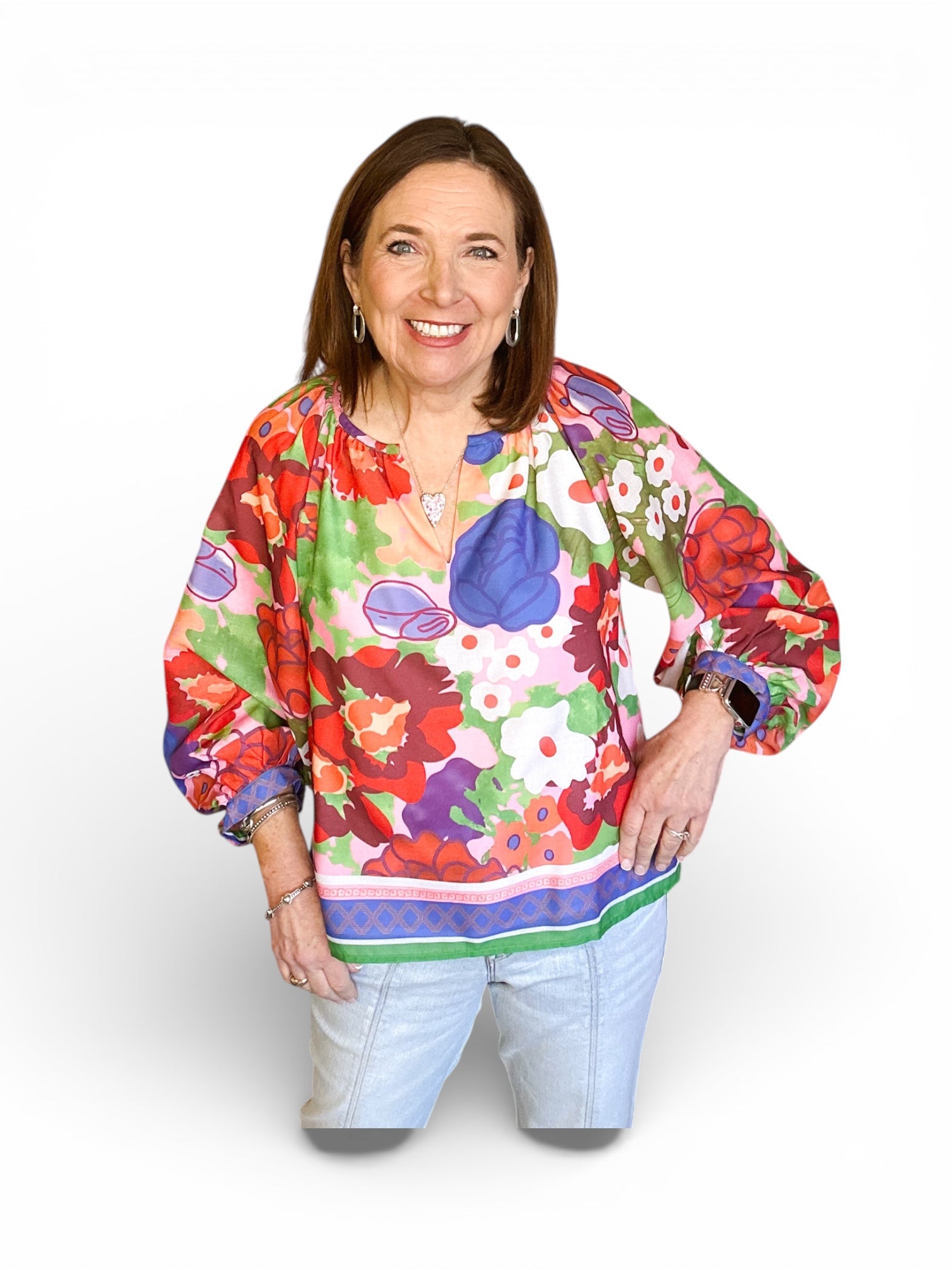 Bright, cheerful, and effortlessly flattering, this vibrant floral top is made to stand out. Featuring a lively mix of bold blooms and playful colors, it’s designed with a relaxed silhouette that drapes beautifully on the body. The soft V-neckline adds a feminine touch, while the three-quarter length sleeves with gathered cuffs create an easy, polished look. Finished with a contrasting border hem for added detail, this top pairs perfectly with denim or white pants for a fresh, feel-good outfit you’ll reach for again and again.