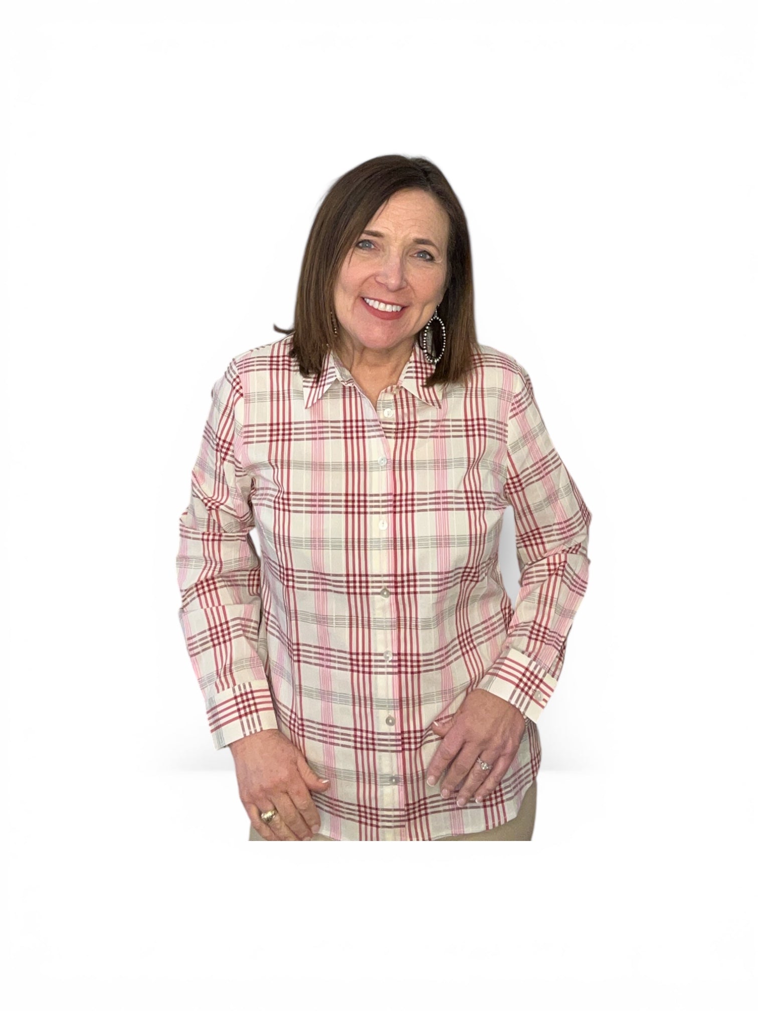 Effortlessly timeless and endlessly versatile, this classic plaid button-down brings relaxed polish to your everyday wardrobe. Designed in a soft neutral base with warm red and subtle muted tones, it’s the perfect balance of cozy comfort and tailored style. The lightweight fabric drapes beautifully while the structured collar and full button front create a clean, flattering silhouette you can dress up or down.