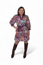 Botanical print 3/4 sleeve mini dress featuring scallop trim V-neck and self-tie waist belt. This woven, non-sheer style is fully lined for comfort and movement. Designed with convenient side pockets and a playful ruffle hem, it offers a flattering, lightweight silhouette perfect for day-to-night wear. Effortless, feminine, and easy to style.