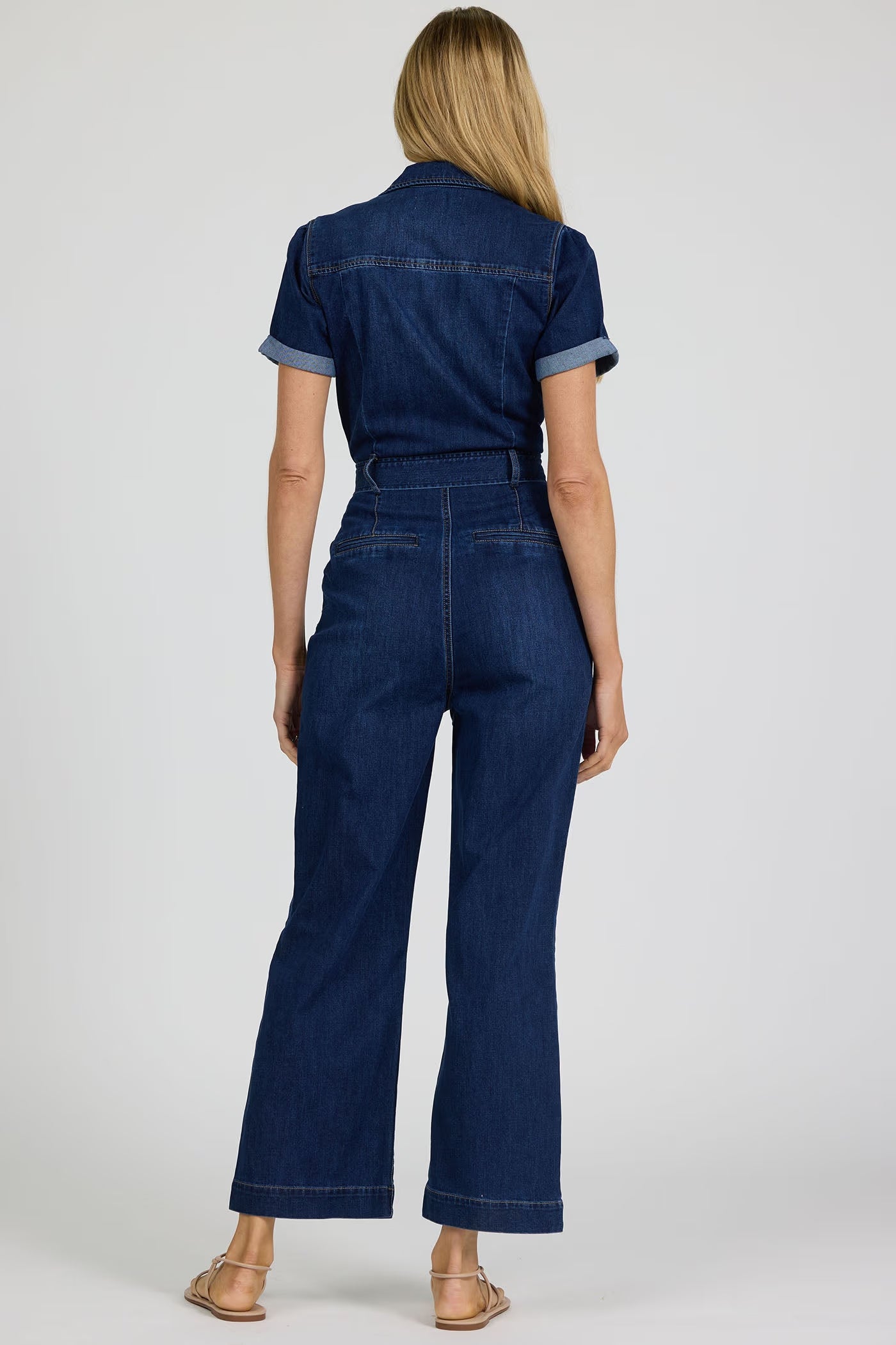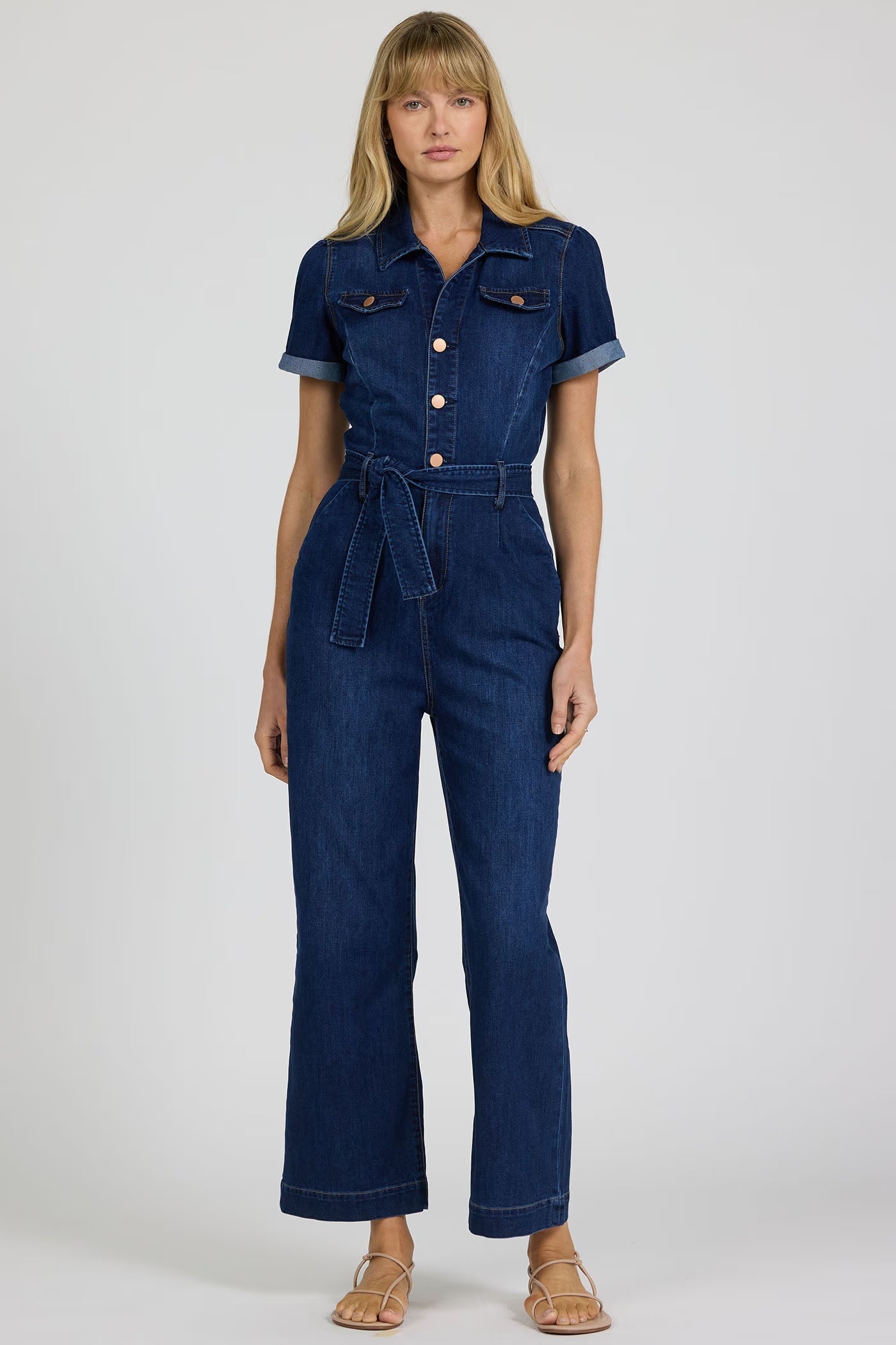 This casual denim jumpsuit for women features a button front with a classic collar and short sleeves that create a relaxed fit that's perfect for summer.  A removable belt adds a touch of versatility, allowing you to cinch the waist for a more defined look.  Crafted in a trendy dark wash, this fashionable one-piece suit boasts a cropped, slim fit that embodies a boho style, making it an ideal choice for a comfortable summer jumpsuit.  This trendy jumpsuit outfit seamlessly blends style and practicality, ensuring it's a go-to piece for any wardrobe.