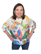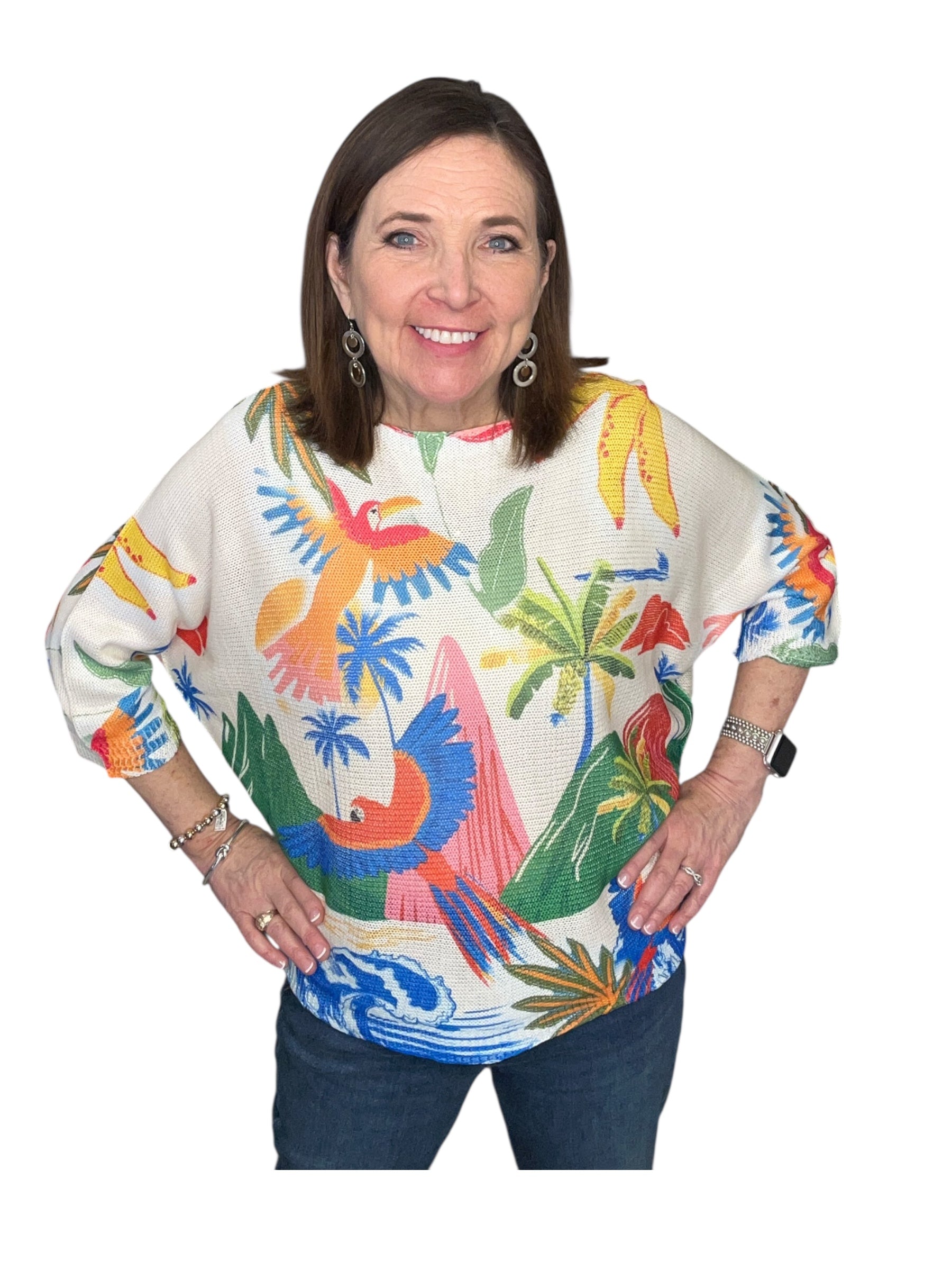 Brighten up your wardrobe with this cheerful tropical-print sweater top! Featuring a soft, lightweight knit and a relaxed, easy fit, this top is covered in vibrant birds, palm trees, and island-inspired colors that instantly give off vacation vibes. The wide neckline and 3/4 sleeves make it flattering and comfortable for everyday wear, while the playful pattern adds the perfect pop of personality. Pair it with jeans, shorts, or white pants for an effortless, fun look all season long.