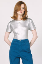 Add a subtle statement to your everyday wardrobe with this sleek metallic silver tee. Designed with a smooth, slightly structured finish, this short-sleeve top offers a modern twist on a classic silhouette. The softly fitted shape skims the body without clinging, making it perfect for styling tucked into high-waisted trousers or worn loose with denim. Lightweight yet eye-catching, it transitions effortlessly from day to night.