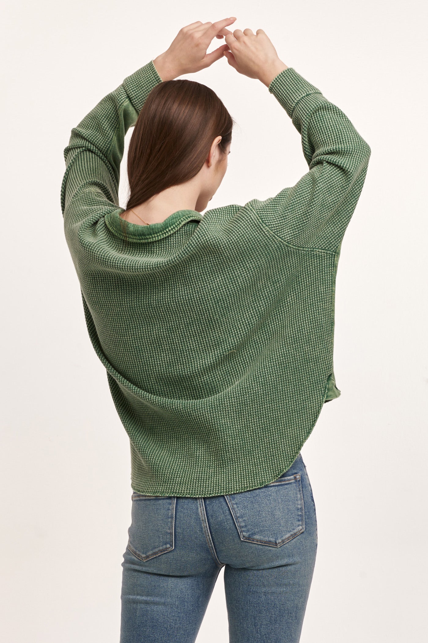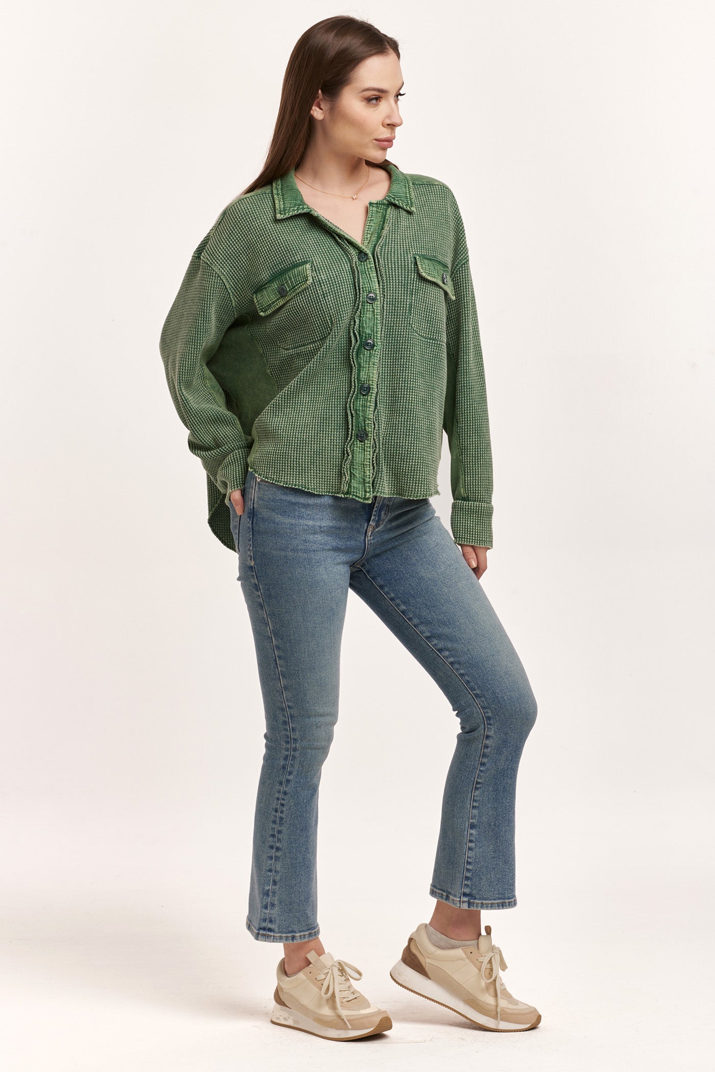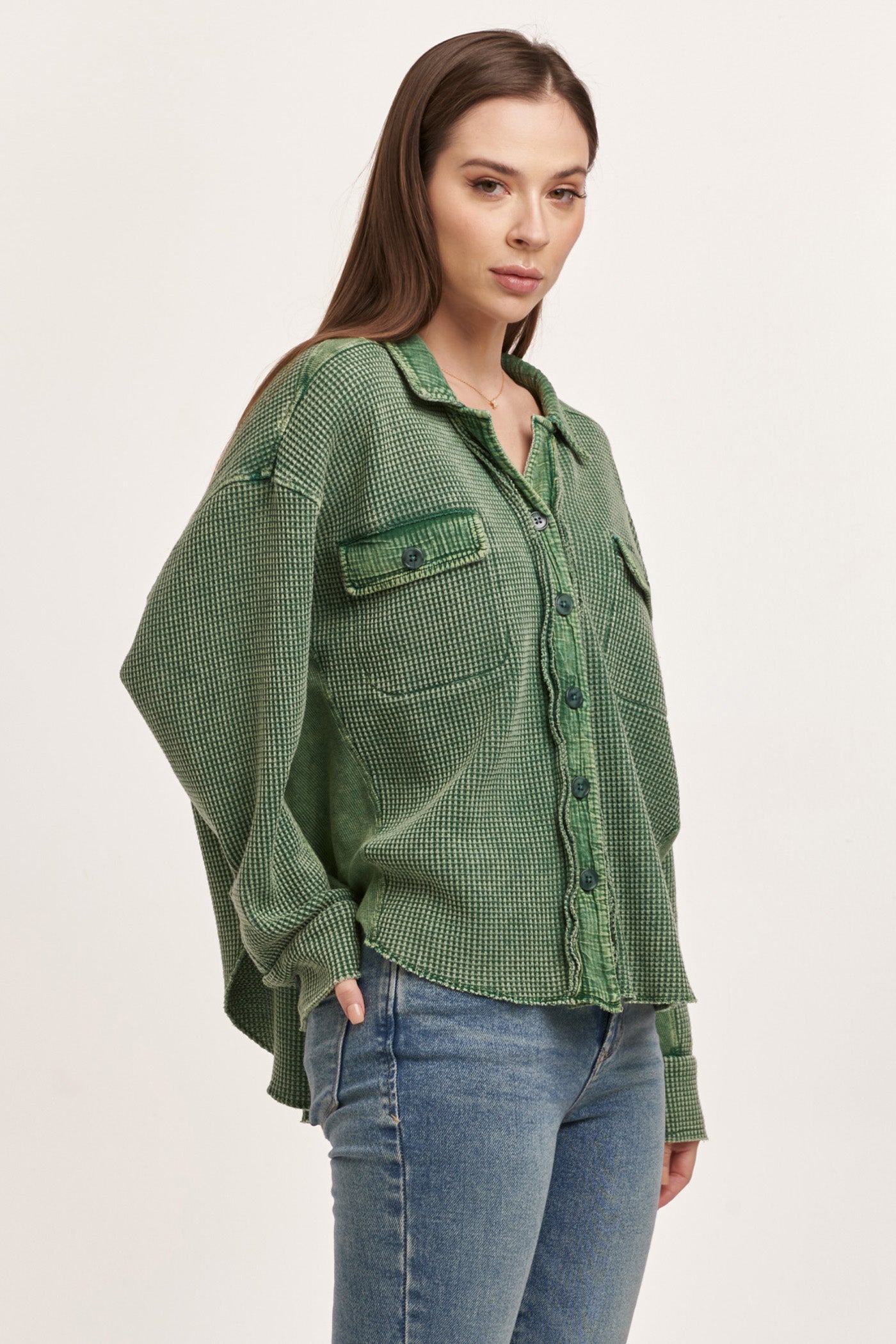 Add a cozy pop of color to your look with this dusty rose button-down top. Made from a soft waffle knit fabric, it features a relaxed fit, raw edge detailing, and a front chest pocket for a touch of utility. The drop shoulder and slightly cropped hem give it an effortless, lived-in feel—perfect for casual days. Pair it with your favorite jeans or leggings for an easy, laid-back vibe.