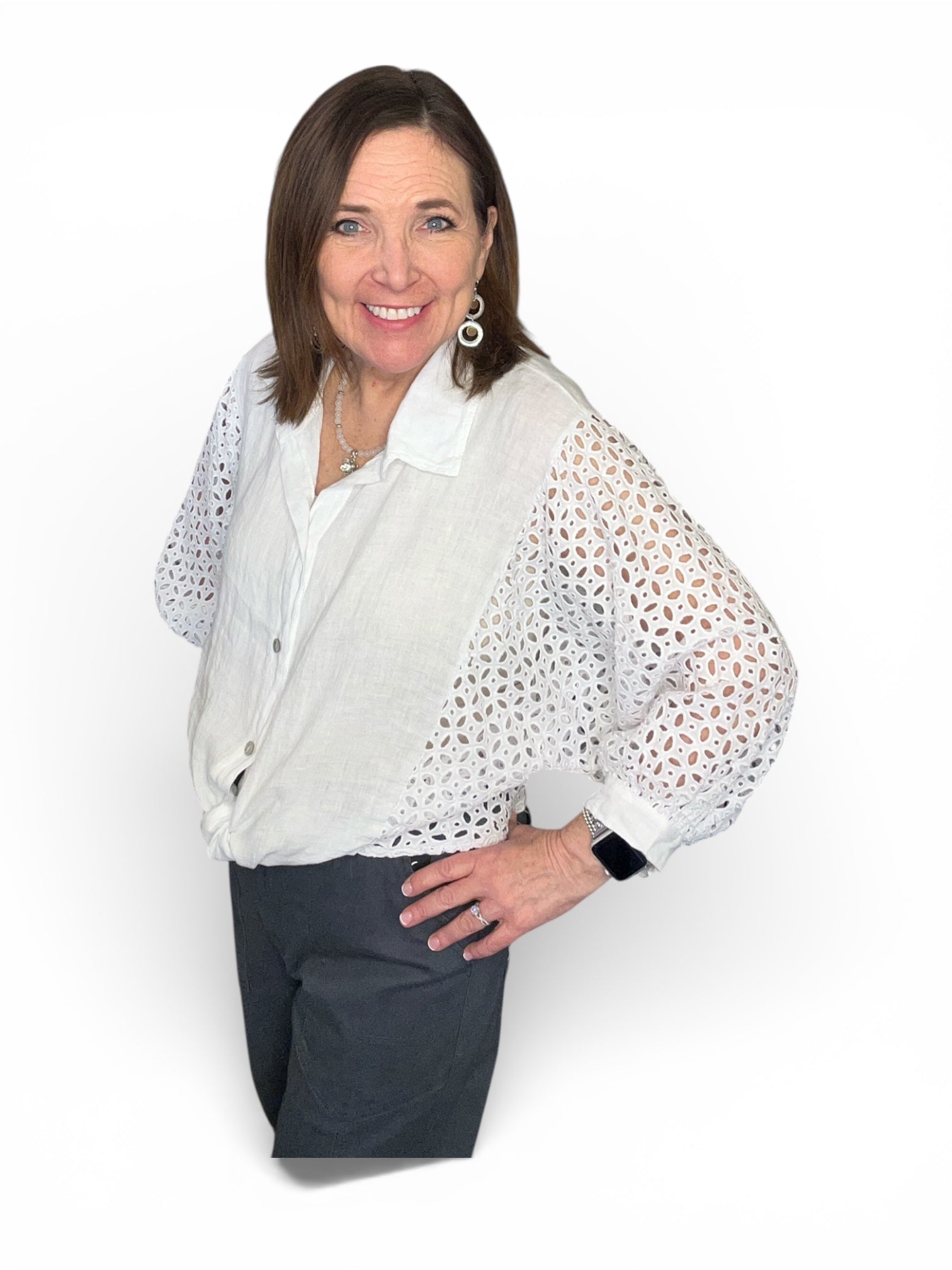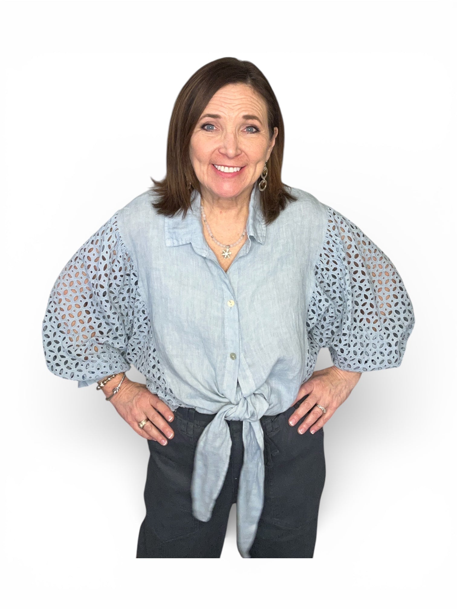 Meet your new warm-weather favorite: a lightweight, button-front top with statement eyelet sleeves that instantly elevates any outfit. Featuring a classic collared neckline and relaxed fit, this piece is finished with a flattering front tie that defines the waist while keeping the look effortless. The airy fabric and cutout sleeve detail add the perfect touch of texture and femininity—easy to dress up with trousers or keep casual with denim.