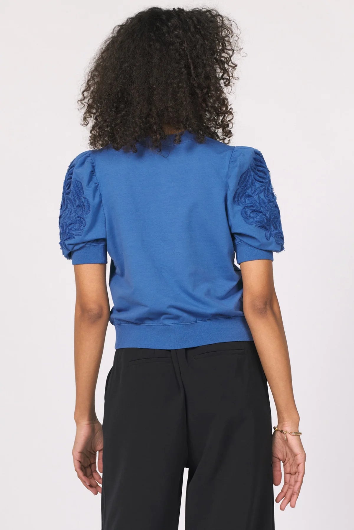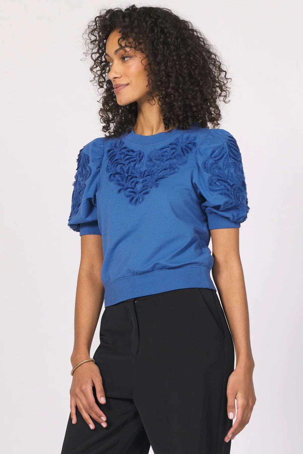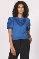 Elegant elbow-sleeve top with embroidery that elevates your casual look. Versatile, comfortable, and stylish, it's a must-have for any wardrobe. Can be layered or worn alone, and fits seamlessly into any lifestyle. Solid color knit in a relaxed fit.