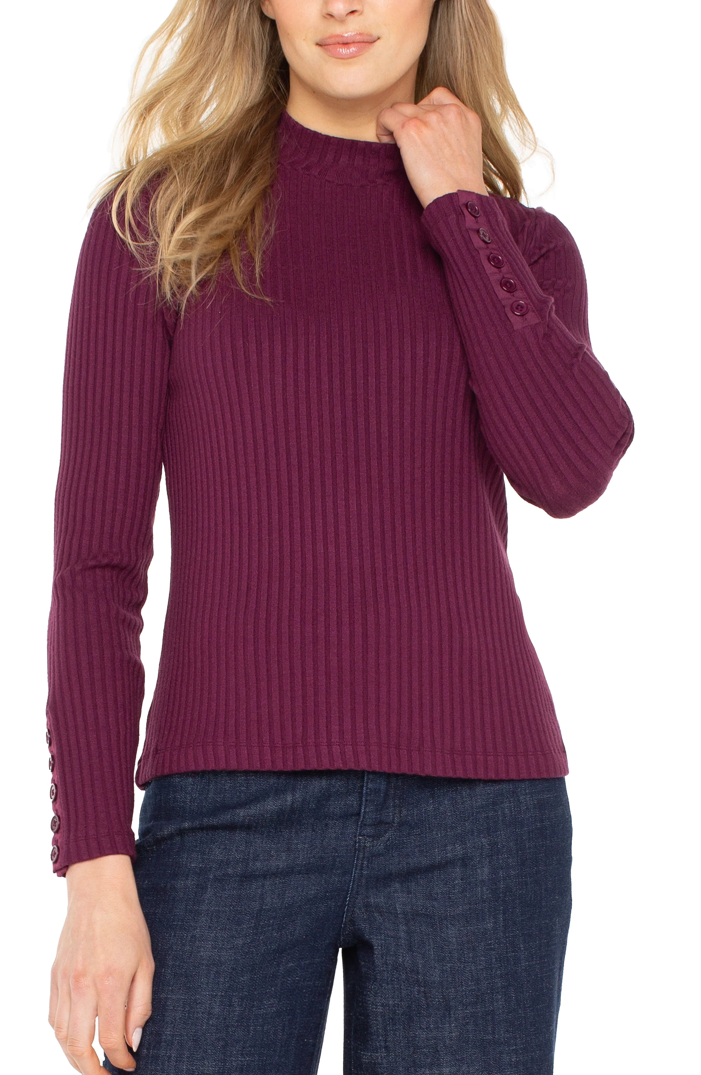 An everyday go-to, made better. This rib-knit mock neck top delivers refined ease with long sleeves, a straight hem, and subtle button details at the cuff. Soft and easy to wear, it’s a versatile staple that moves seamlessly between seasons—and looks good in every color. 80% Viscose 18% Polyester 2% Elastane