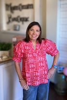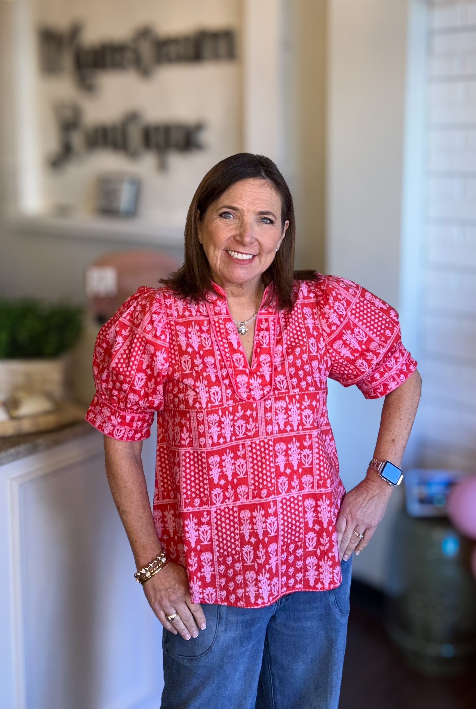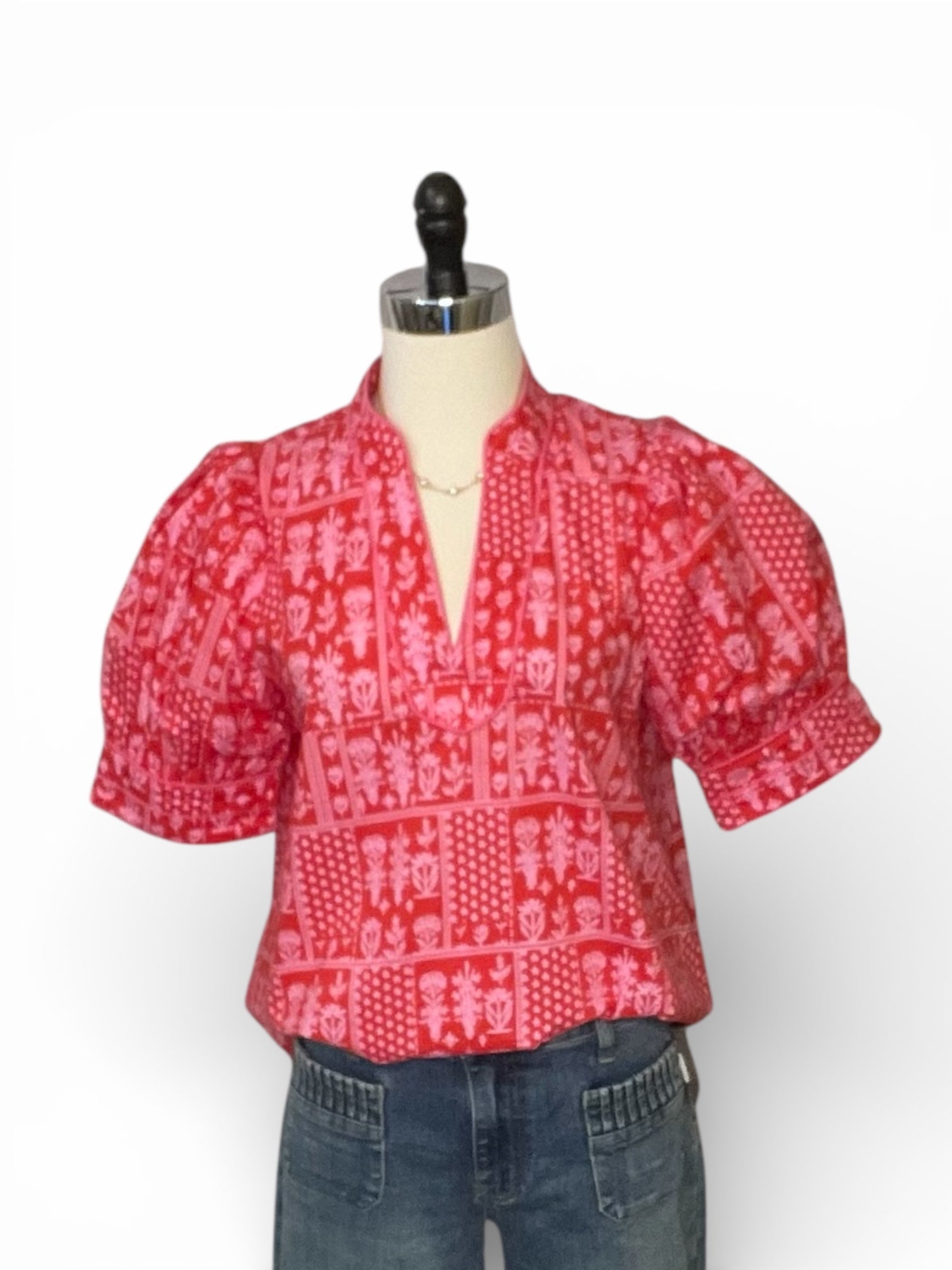 Bold yet effortless, this printed short-sleeve top brings instant charm to any look. Designed with a relaxed silhouette, it features a flattering split neckline and soft puff sleeves for a touch of feminine volume. The vibrant red and pink block-print pattern adds eye-catching texture while remaining easy to style. Lightweight and breathable, it’s perfect for everyday wear—tucked into denim, paired with tailored shorts, or dressed up with statement accessories. A feel-good piece you’ll reach for again and again.