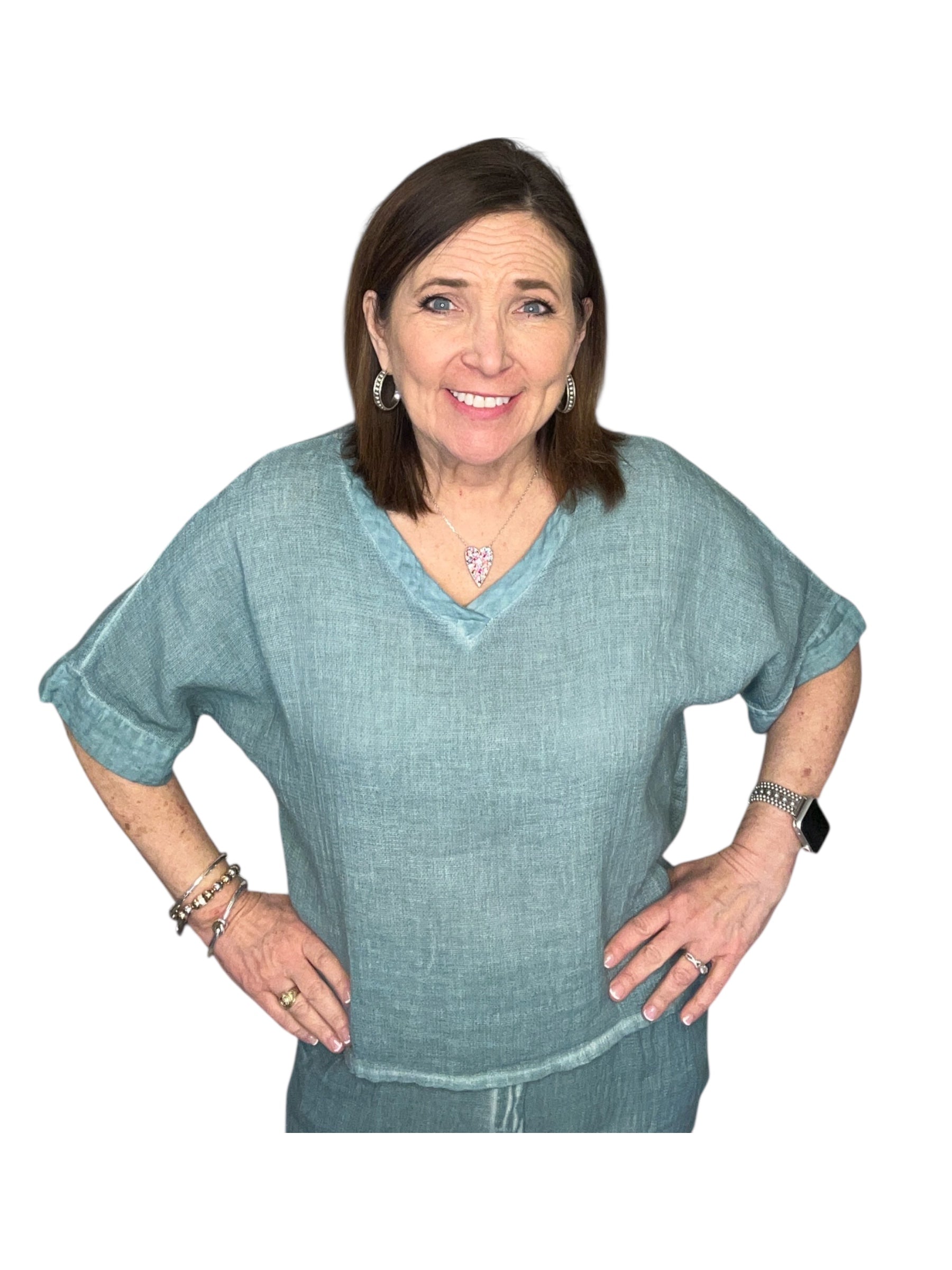 Breezy, effortless, and endlessly wearable—this linen top is your go-to for everyday comfort with a polished finish. Designed with a relaxed fit, flattering V-neckline, and easy short sleeves, it drapes beautifully while keeping you cool and comfortable all day long. The soft, lightweight linen fabric gives it that perfectly lived-in look you’ll reach for season after season.