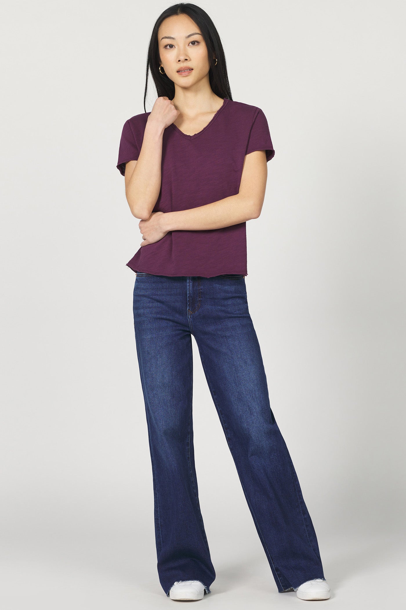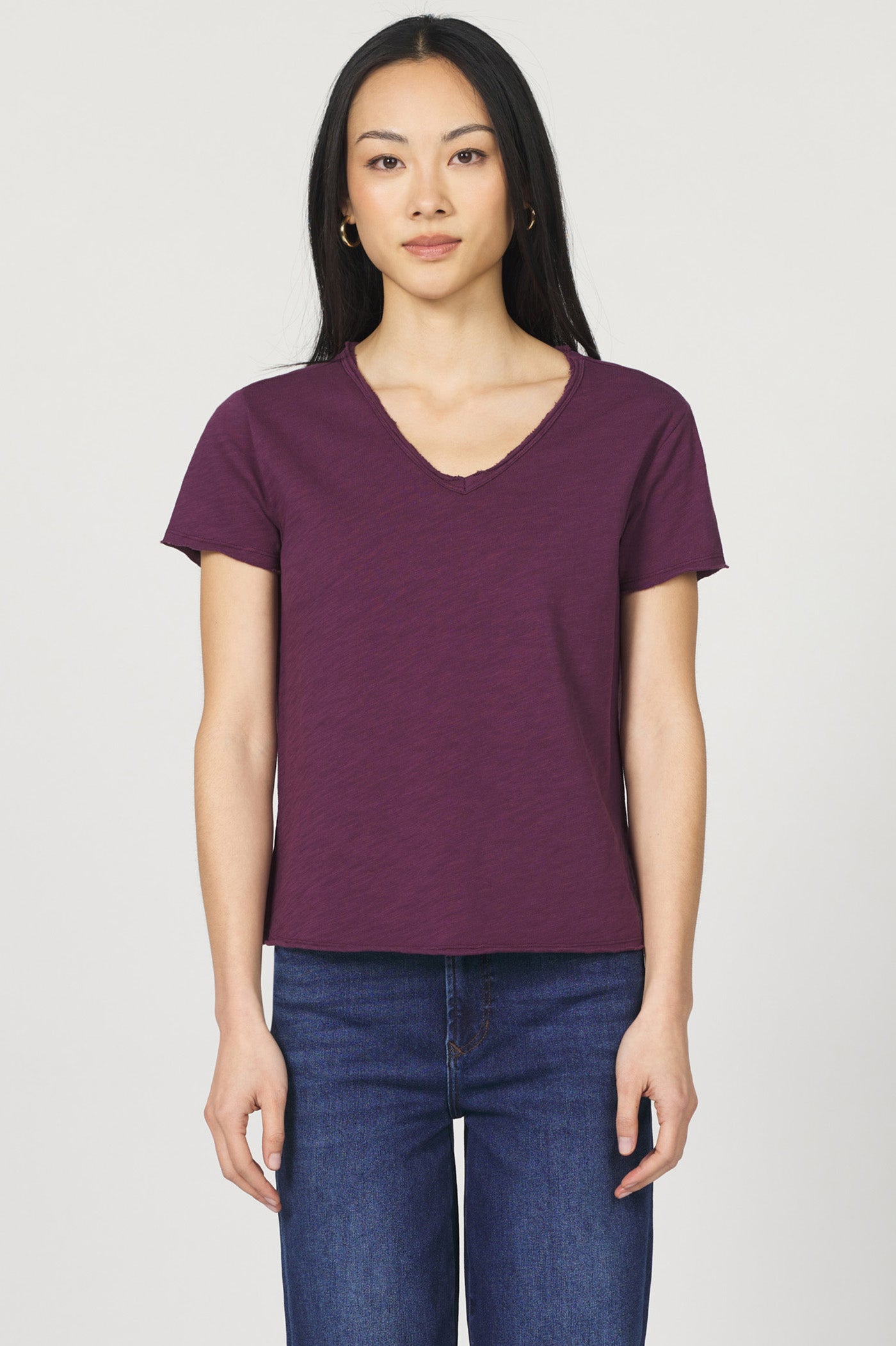 Effortless and versatile, this deep plum V-neck tee is the perfect everyday staple. Crafted from soft, breathable cotton with a lightly textured finish, it offers a relaxed fit that drapes comfortably while keeping its shape. The raw-edge neckline adds a modern touch, making it easy to wear alone or layered under jackets and cardigans. Pair it with your favorite denim or dress it up with tailored pants for endless styling options.