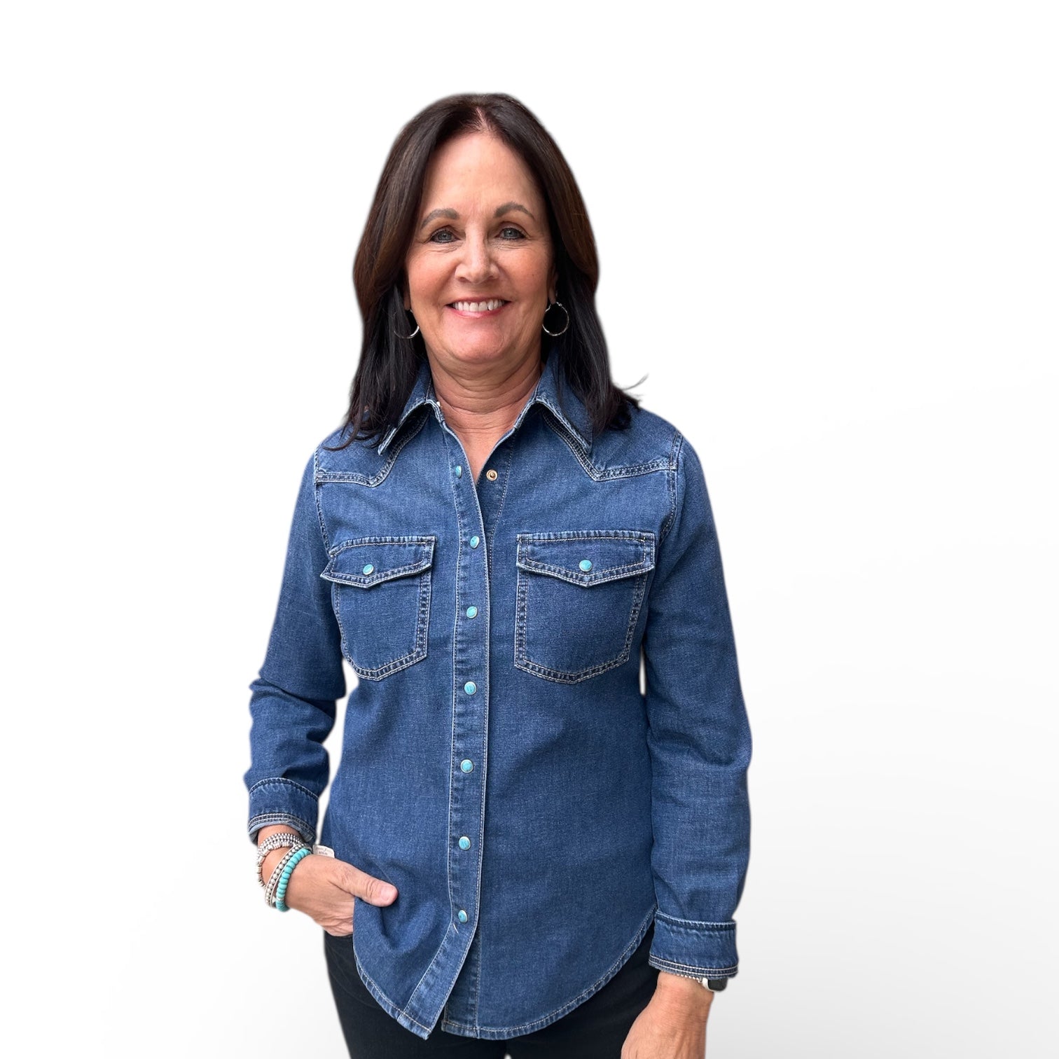 This timeless denim top blends classic western-inspired details with an easy, flattering fit—perfect for everyday wear.