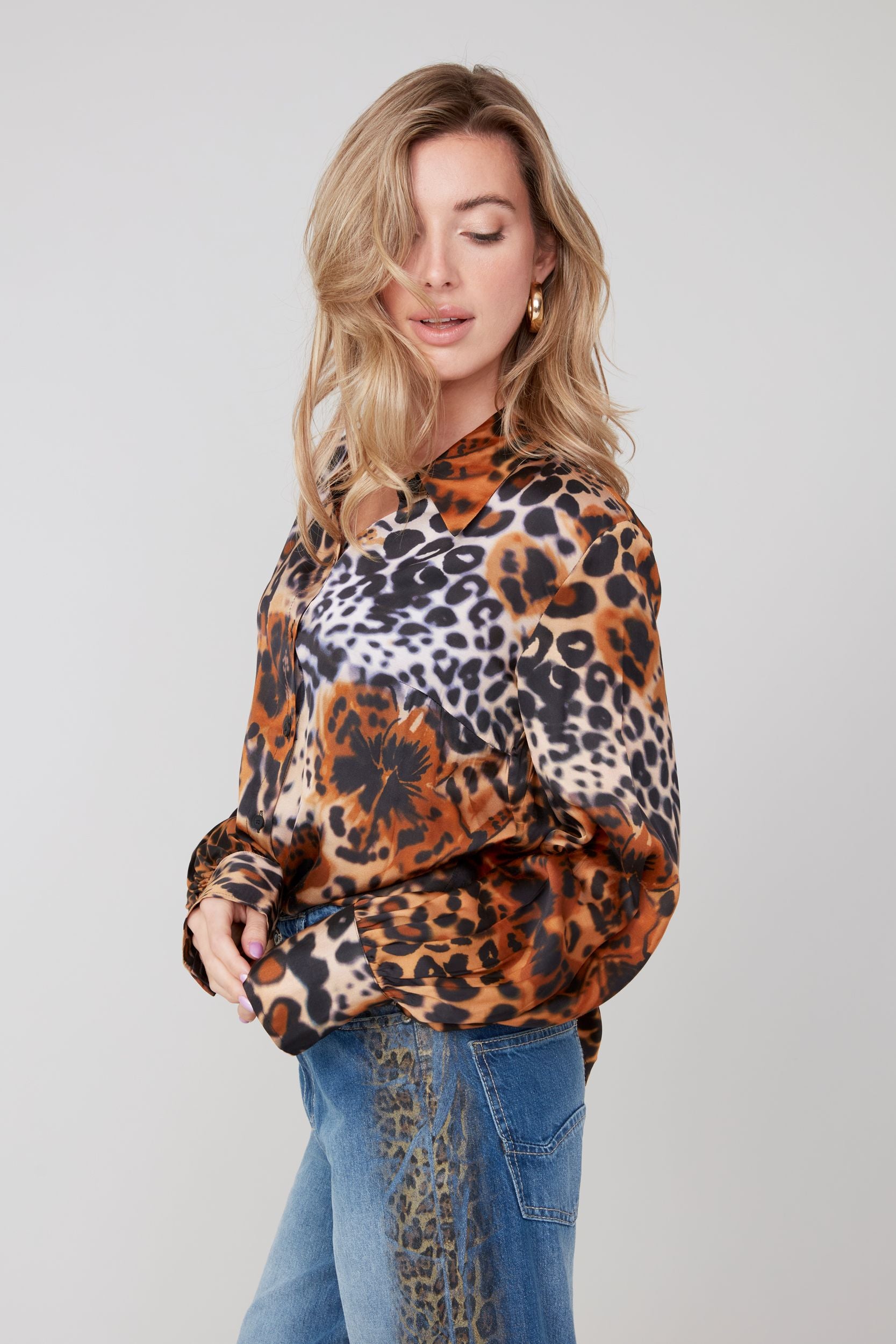 Unleash your wild side with this bold animal-print blouse. Designed in a silky, flowy fabric, this button-down top features a striking mix of leopard and cheetah prints in warm tones of tan, caramel, and black. The relaxed silhouette pairs effortlessly with its classic collar, long blouson sleeves, and wide cuffs for an elevated touch. Perfect for dressing up with sleek trousers or styling casually with denim, this statement blouse transitions seamlessly from day to night.