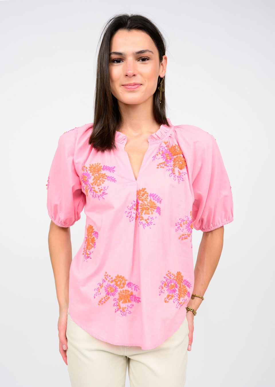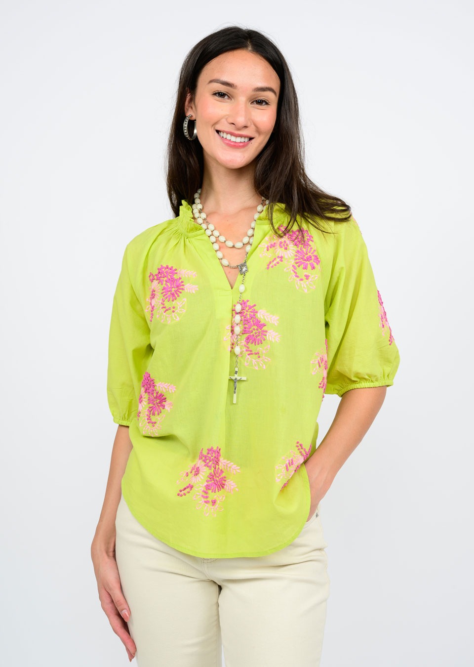 This vibrant lime green blouse features delicate pink floral embroidery, adding a charming and feminine touch. Designed with a relaxed fit, gathered neckline, and elbow-length puff sleeves, it offers effortless style and comfort. Also comes in soft pink.