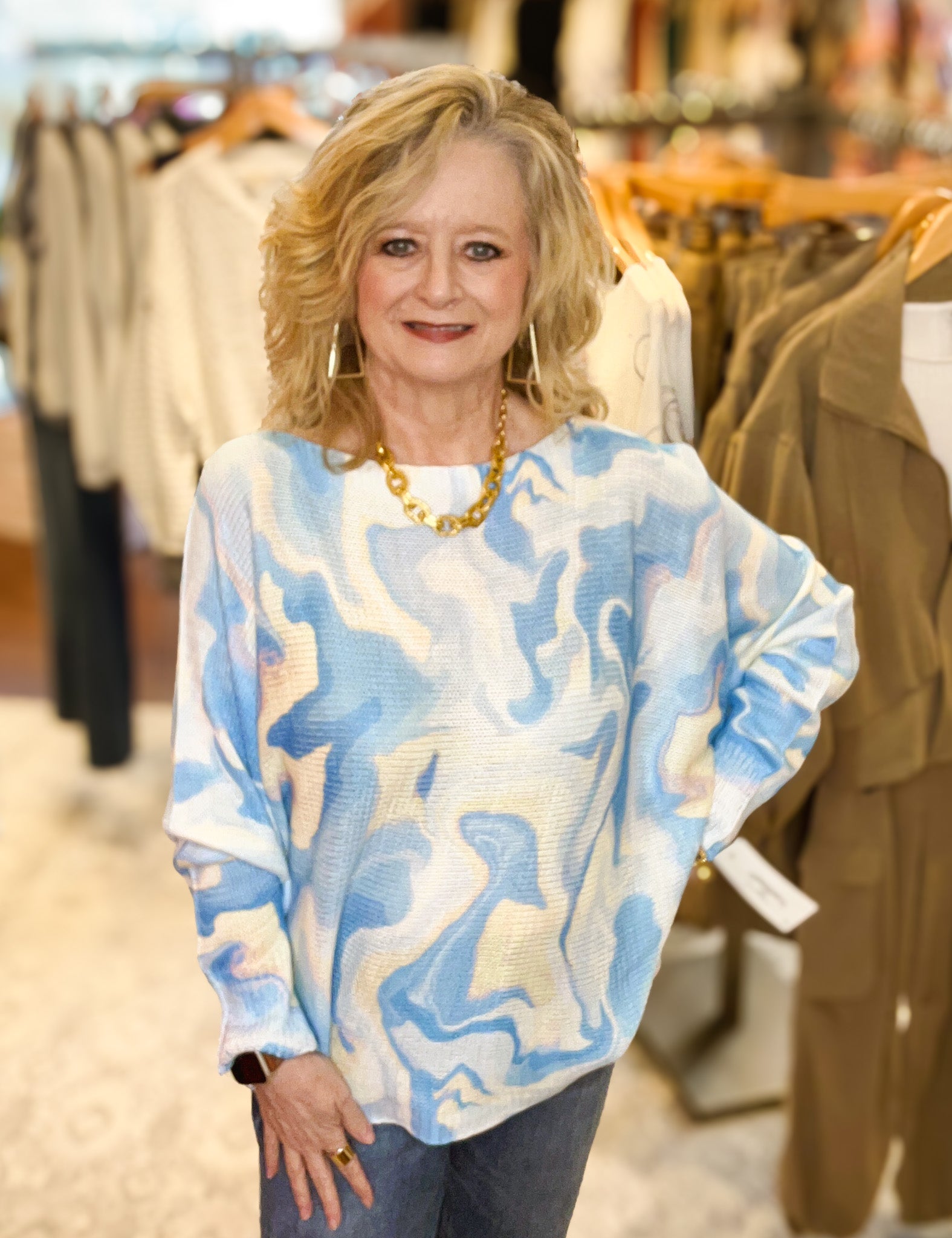 Embrace effortless style with this lightweight sweater featuring a dreamy watercolor-inspired print in soft blues, creams, and hints of gold. Designed for comfort and versatility, its relaxed fit and breathable knit fabric make it perfect for layering or wearing on its own. Whether paired with denim or neutral bottoms, this statement piece adds an artistic and elegant touch to any wardrobe.