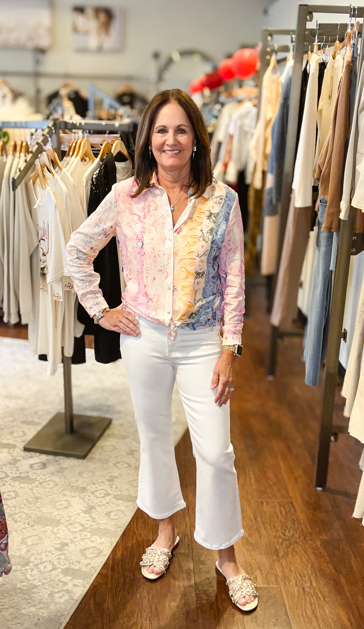 This vibrant top features a mesmerizing marbled print in a mix of pastel and jewel tones, creating a bold and artistic statement. The classic button-down silhouette is elevated with a playful front tie detail, adding a modern and relaxed vibe. Made from lightweight, flowy fabric, it drapes beautifully and feels comfortable for all-day wear. Perfect for pairing with jeans or skirts, this top effortlessly transitions from casual outings to chic evenings.