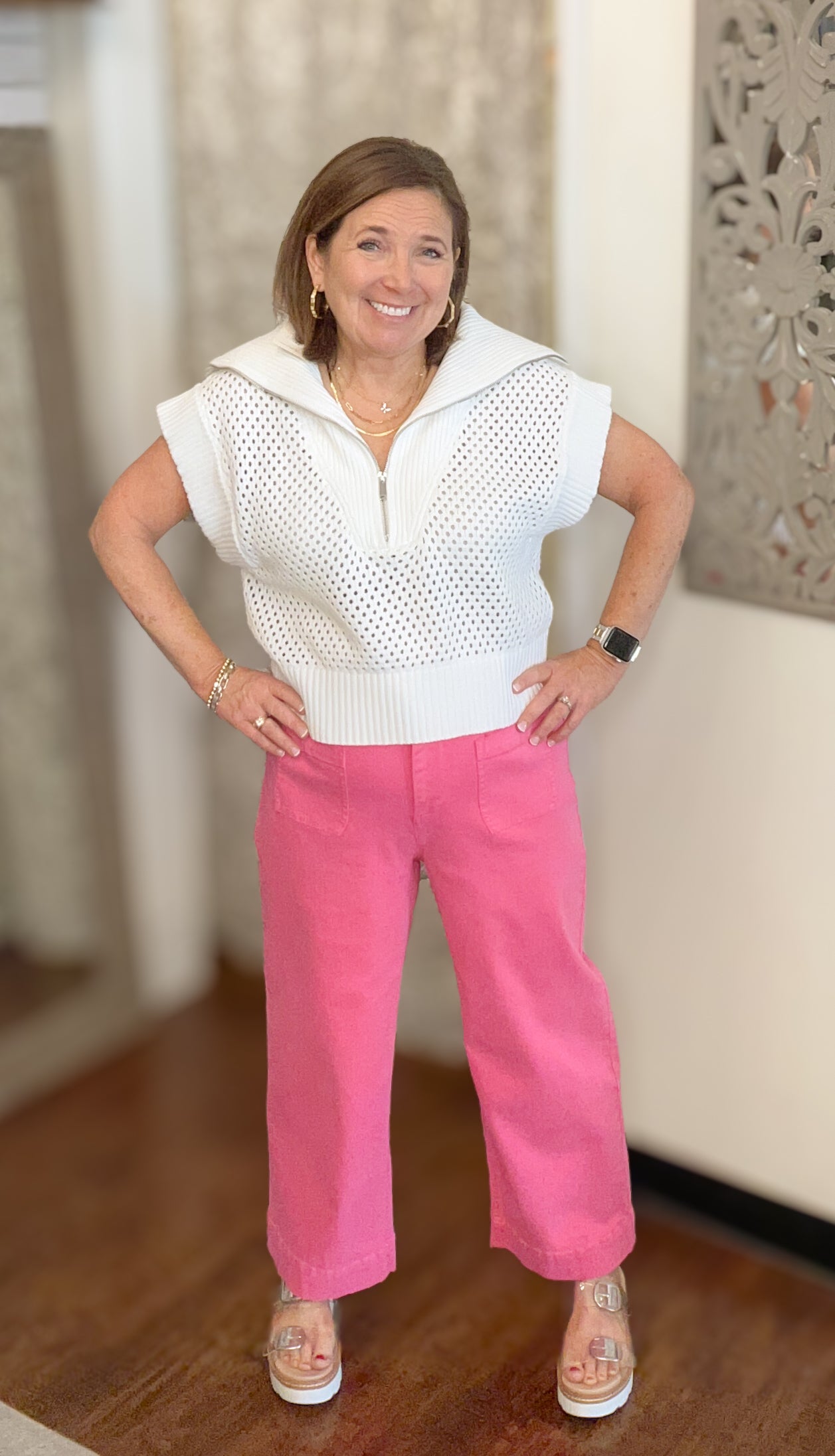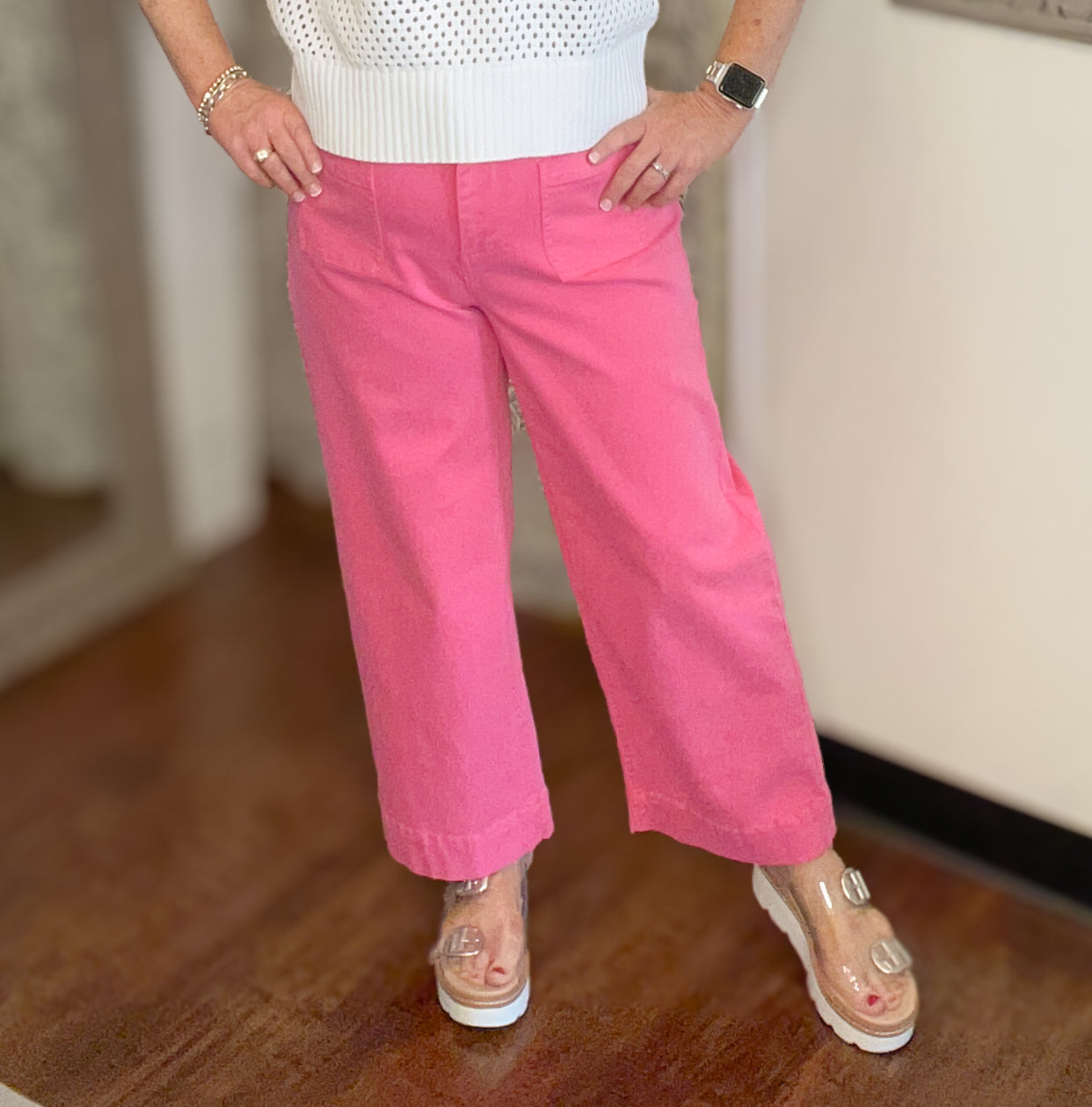 These cropped pants feature a bold and vibrant pink color, adding a fun and playful touch to any outfit. Designed with a relaxed, wide-leg silhouette, they offer both comfort and effortless style. The high-waisted fit and front patch pockets enhance their casual yet chic appeal, making them perfect for warm-weather wear.